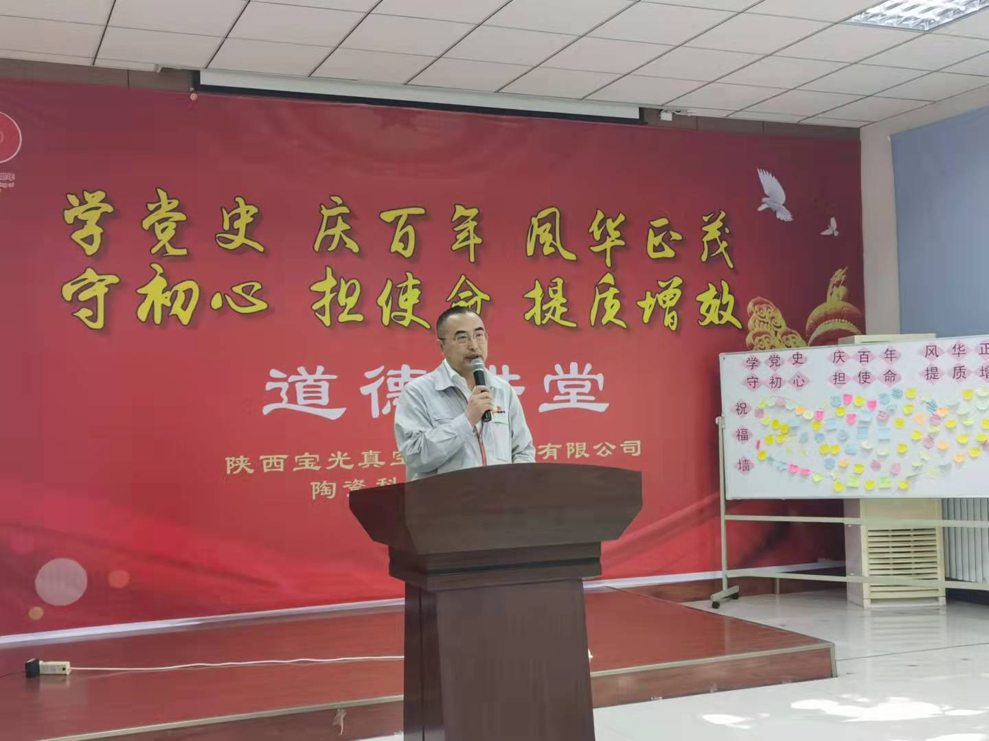 “唱支山歌給黨聽, 我把黨來比母親......”9月30日下午,在高昂激越、催人奮進(jìn)的歌聲中,由寶光股份黨委工作處主辦,陶瓷科技公司黨支部承辦的“學(xué)黨史、慶百年、風(fēng)華正茂; 守初心、擔(dān)使命、提質(zhì)增效”主題道德講堂盛大開啟。寶光股份黨委書記、總經(jīng)理謝洪濤,寶光股份工會主席、紀(jì)委書記付宗喜,寶光股份副總經(jīng)理袁軍為應(yīng)邀出席活動。