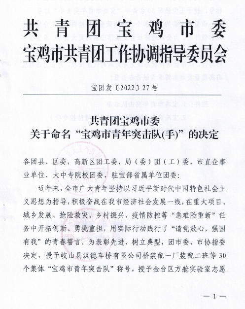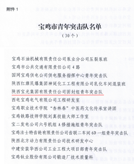 近日,從團市委獲悉,寶光股份固封班組被授予“寶雞市青年突擊隊”榮譽稱號。