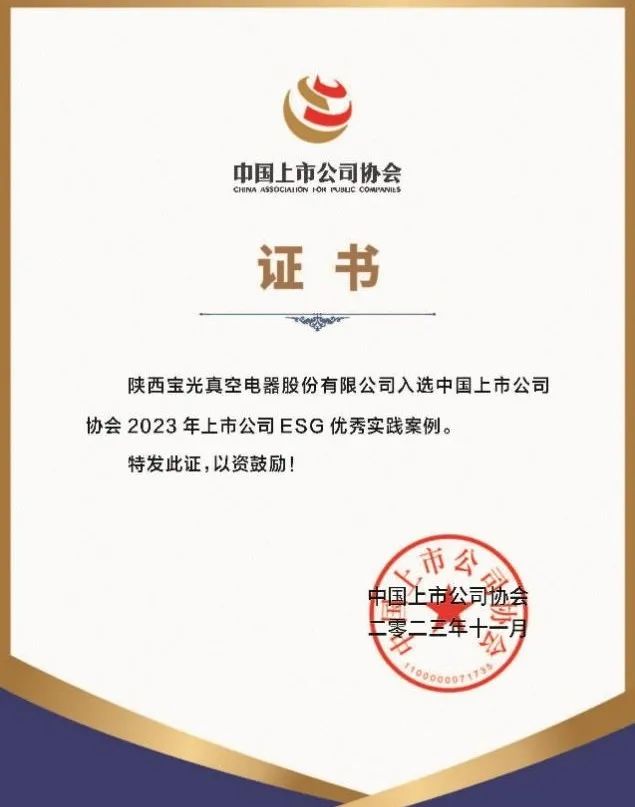同日,寶光股份順利通過(guò)中國(guó)上市公司協(xié)會(huì)可持續(xù)發(fā)展(ESG)專業(yè)委員會(huì)專家三輪評(píng)審和復(fù)核,獲選年度“上市公司ESG優(yōu)秀實(shí)踐案例”。